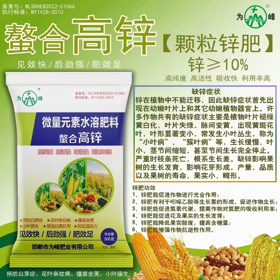 顆粒鋅肥螯合高鋅為峰肥業(yè)全水溶顆粒鋅2024-07-25螯合高鋅是為峰肥業(yè)全水溶顆粒鋅肥,葉面吸收效率高、速度快,可有效預(yù)防作物因缺鋅造成的生長不良、小葉、黃葉、植株矮小、早衰、品質(zhì)下降等現(xiàn)象,增加作物光合效率,促進(jìn)植株發(fā)育,提高植物抗逆能力,增加產(chǎn)量、提高品質(zhì)。